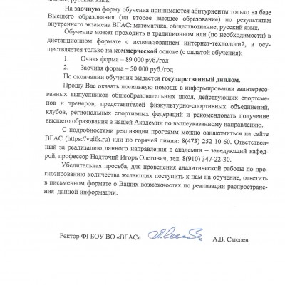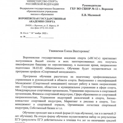ФГБОУ ВО "Воронежская государственная академия спорта" приглашает всех желающих получить квалификацию бакалавр, а также второе высшее образование, по направлению подготовки "Менеджмент". Обучение по программе профиля "Спортивный менеджмент".